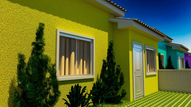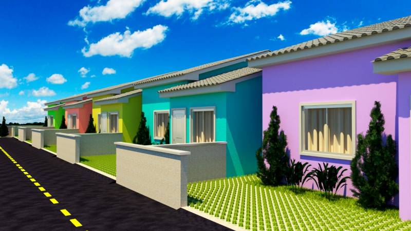 Casas de 2 qtos, sendo 1 suíte, sala e cozinha, banheiro social, pátio, vaga estacionamento, área de lazer com piscina adulto, infantil e salão de eventos.