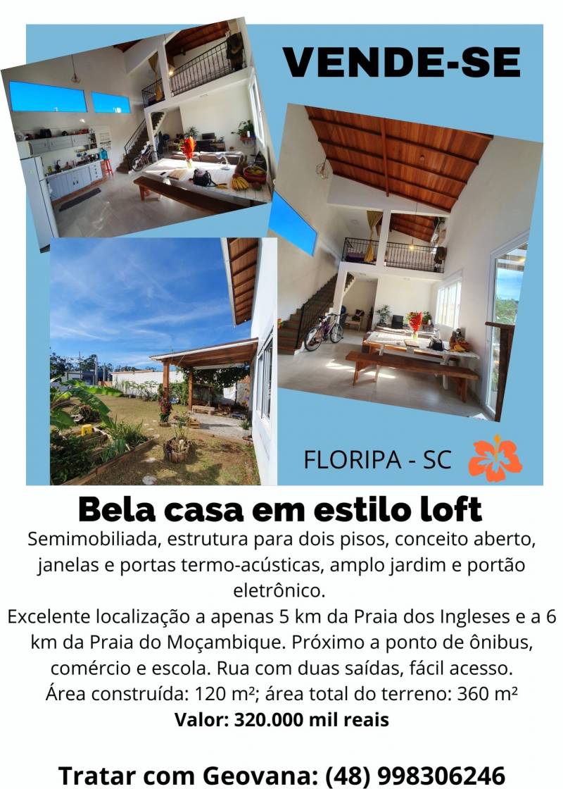 Casa semi-mobiliada com estrutura para dois pisos, em conceito aberto, com janelas e portas termo-acústicas, área de serviço externa acoplada, amplo jardim com espaço para garagem e portão eletrônico. Excelente localização no bairro Rio Vermelho, a apenas 5 km da Praia dos Ingleses e a...